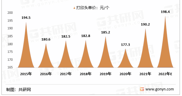 從均價(jià)來看,2015-2020年,我國(guó)打印頭市場(chǎng)單價(jià)總體呈下降趨勢(shì),2021年回升至190.2元/個(gè),2022年我國(guó)打印頭市場(chǎng)單價(jià)上漲至大約198.4元/個(gè),呈現(xiàn)上漲的趨勢(shì)。