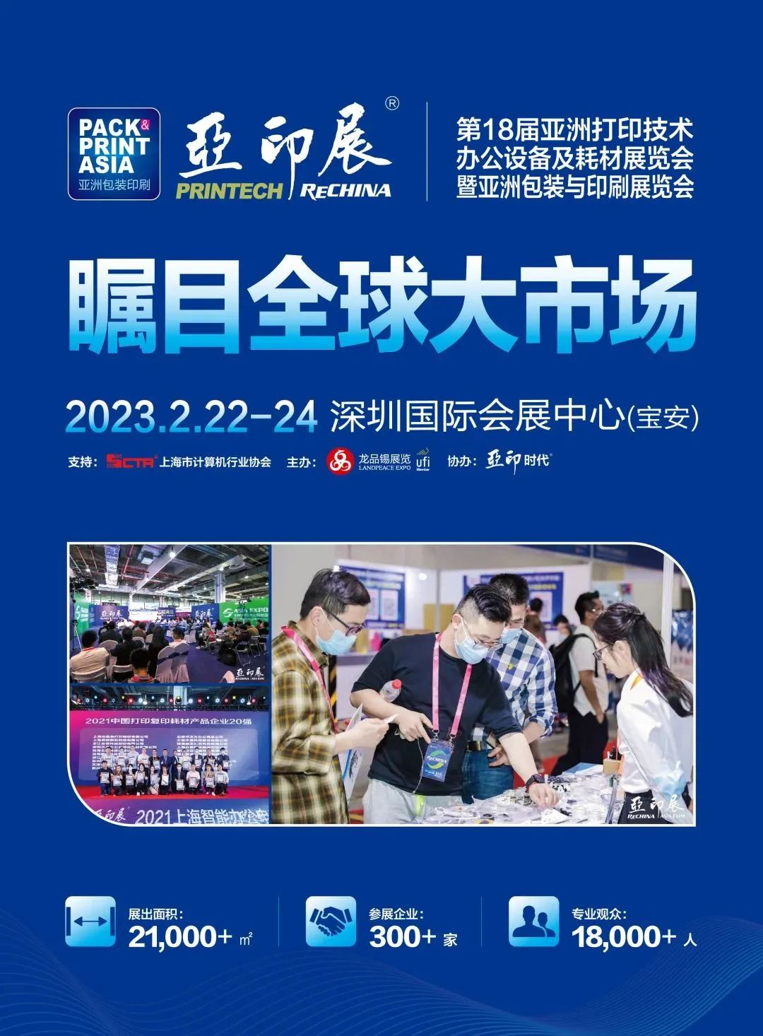 第18屆亞洲打印技術(shù)辦公設(shè)備及耗材展覽會(huì)暨亞洲包裝與印刷展覽會(huì)(亞印展),將于2023年2月22-24日,在深圳國際會(huì)展中心(寶安新館)舉行。同期舉辦,亞洲包裝與印刷展覽會(huì)。第18屆亞印展,由上海市計(jì)算機(jī)行業(yè)協(xié)會(huì)支持,上海龍品錫亞印展覽主辦,亞印時(shí)代合辦。規(guī)劃展出面積21000平方米,預(yù)計(jì)參展企業(yè)300余家,專業(yè)觀眾18000人次。